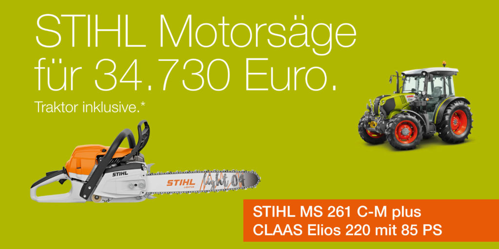 Jetzt Stihl Kettensäge MS 261 C-M sichern und einen Traktor CLAAS Elios 220 dazu bekommen.